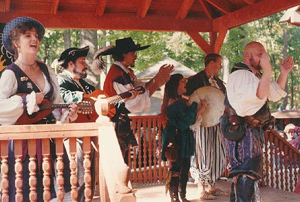 Onstage at the White Hart Tavern: Lady Vanity, 2d Mate Long John Skivvy, Louis the Moor, Peg Reilly, 1st Mate Ensign Wesley Stubbs and Capt. Fletcher T. Moon.