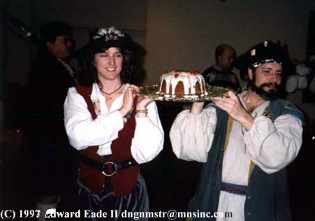 PARTY! Kat and Skivvy carry in the Holiday Plum Pudding to much bagpiping and fanfare.