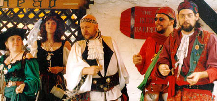 Left to right: Peg, Lady Vanity, First Mate Fletcher Moone, Harvey Blind Pew and Captain Jack Rackam.