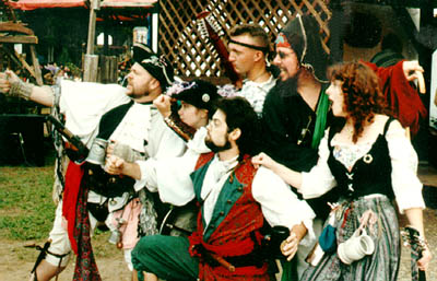 The crew strikes a heroic pose outside the Boar's Head Tavern.
