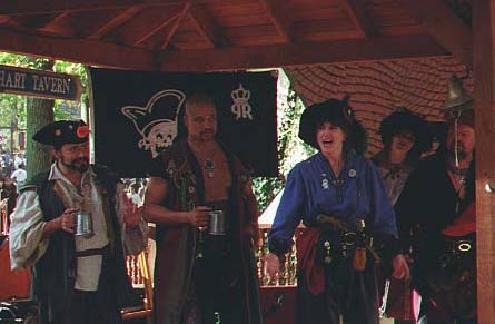 The men on the crew look skeptical as Kat sings about the women on shore.